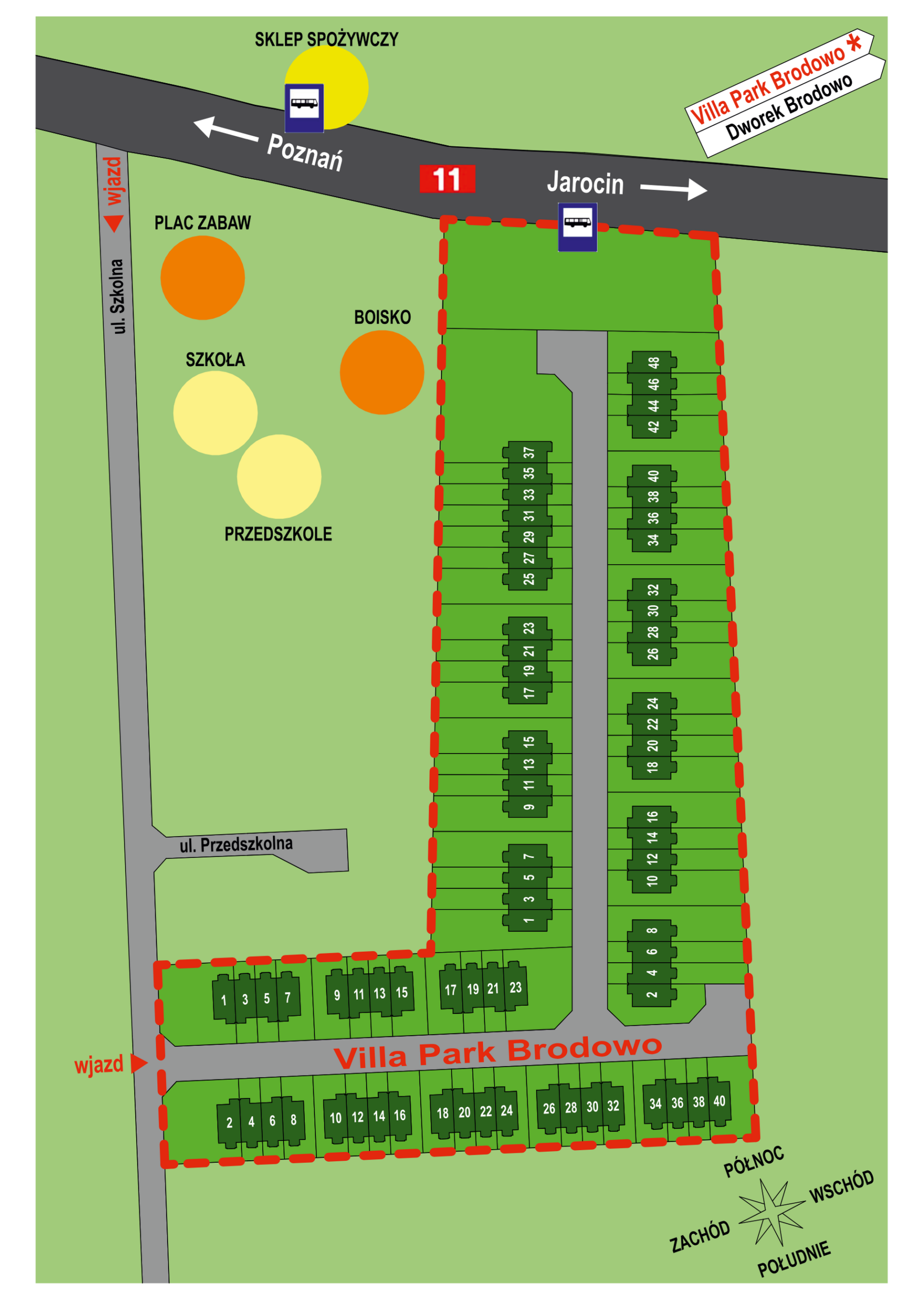 Villa Park Brodowo to kompleks 75 wyjątkowych jednorodzinnych domów w zabudowie szeregowej, w koncepcji najczęściej 4 segmentowej, optymalnie zaprojektowany na niemal 2,5 ha działce w centrum Brodowa. Szerokie drogi prowadzące do posesji, zapewniają dogodny dojazd i sprawną komunikację, a każdy z segmentów posiada min. 2 miejsca parkingowe.