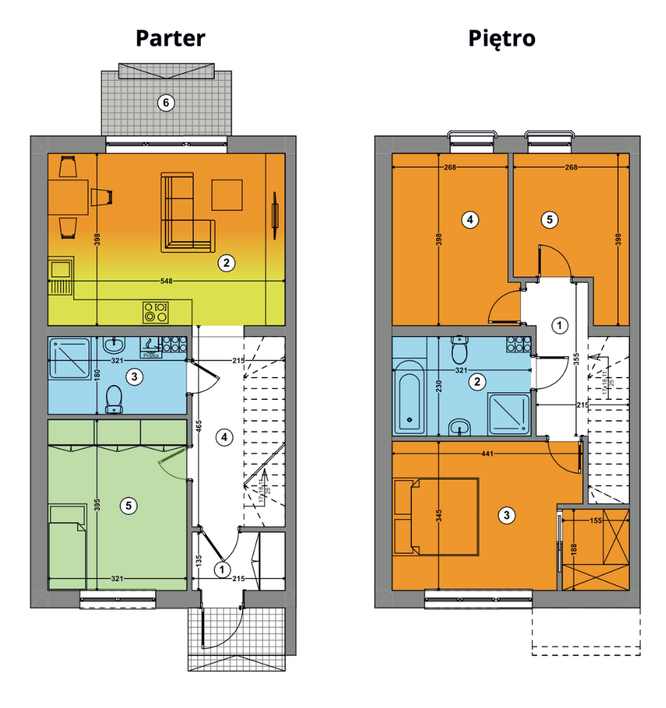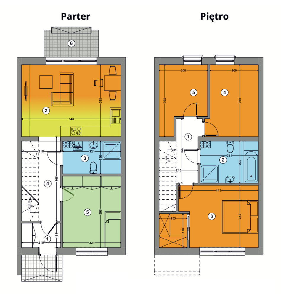 - Budynek dwukondygnacyjny, niepodpiwniczony, każdy segment stanowi osobną, niezintegrowaną jednostkę w szeregu, ściany niewspółdzielone z innymi budynkami